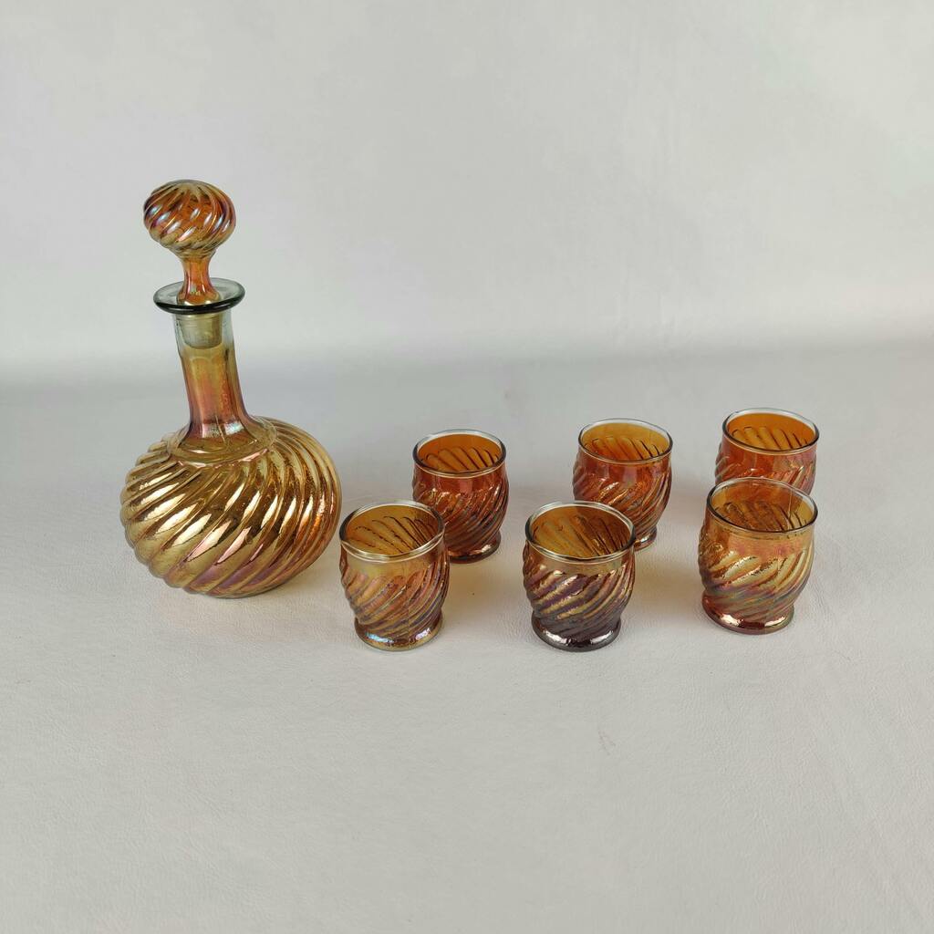 Licoreira antiga em vidrão na cor fogo, acompanham seis copinhos. Mede 23cm de altura.