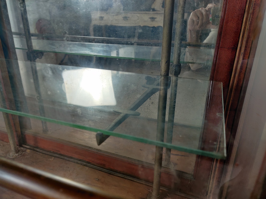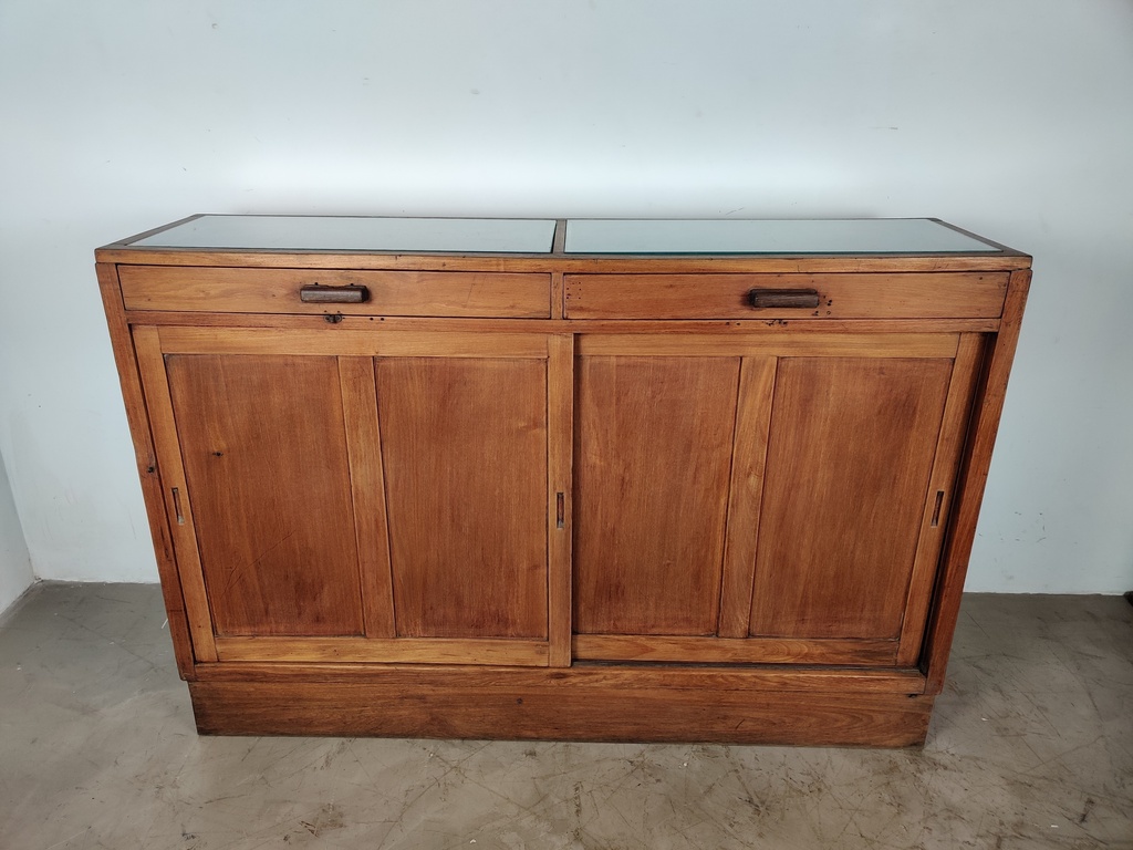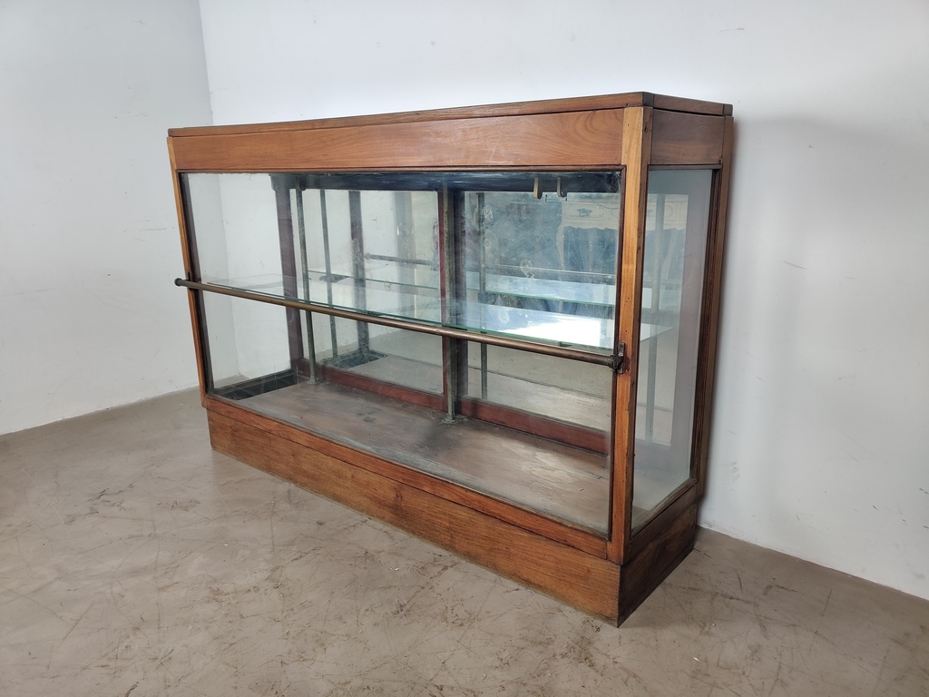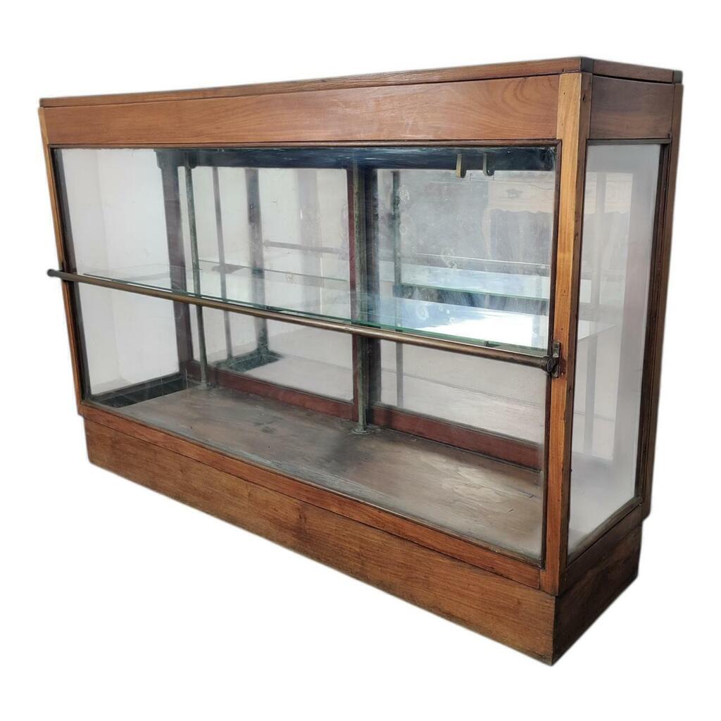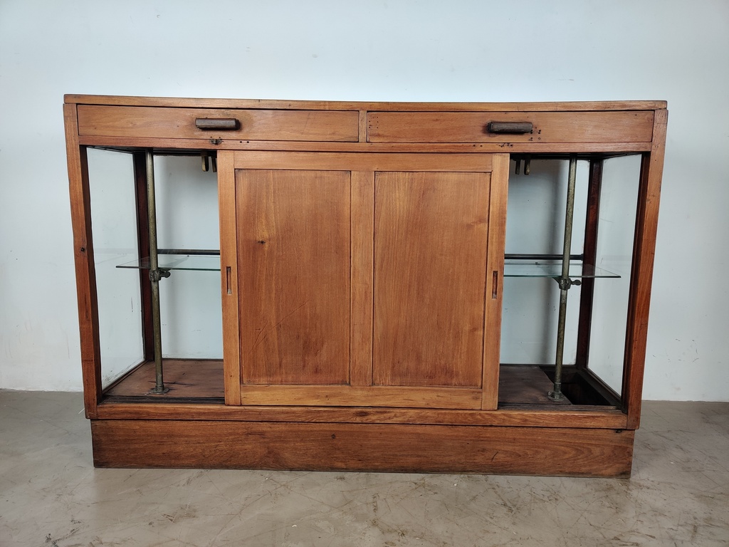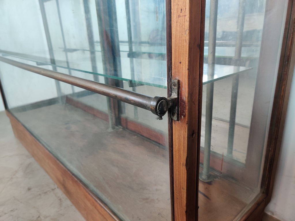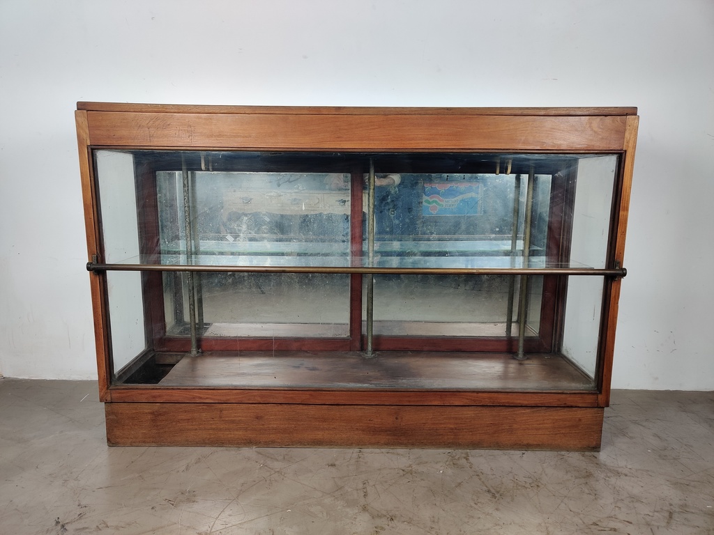 Balcão expositor em madeira de peroba com frente e laterais em vidro. Com sistema de elevação da prateleira interna, que permite ajustar a altura conforme necessário - recurso prático e bem executado. A peroba apresenta bela pátina natural do tempo, com veios característicos da madeira. Peça versátil, funciona bem tanto para uso comercial quanto residencial. Ideal para exposição de coleções, objetos decorativos, antiguidades ou itens de valor. Móvel autêntico de época, com acabamento artesanal típico da marcenaria tradicional brasileira. Estado original de conservação. Mede 1.50m x 40cm x 1m altura.
