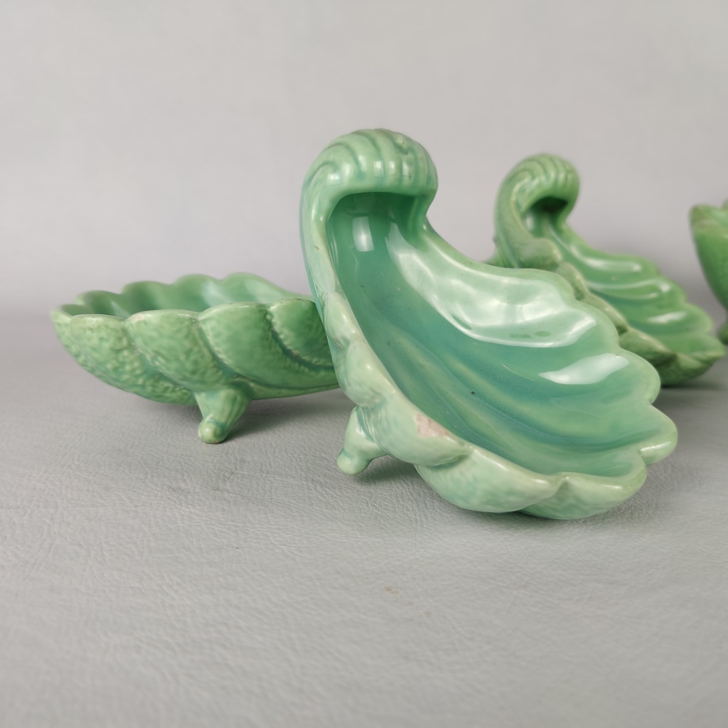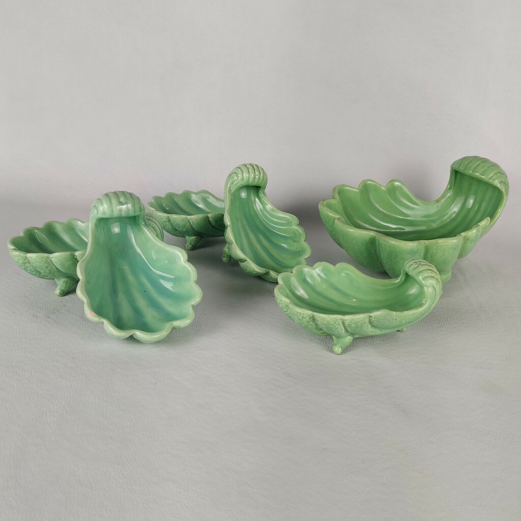 Conjunto de saladeira em louça verde com formato de concha. Composto por bowl principal e cinco cumbucas individuais. Peças com acabamento esmaltado e detalhes em relevo que reproduzem nervuras naturais das folhas. Mede 23cm x 12cm.